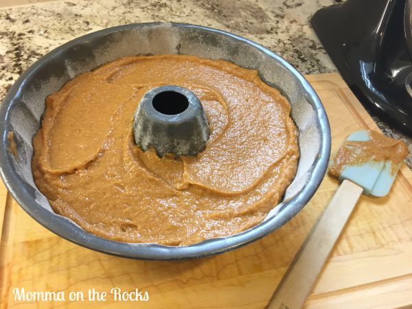 Mix all that pumpkin-y goodness together, and pour it in your floured & greased pan.