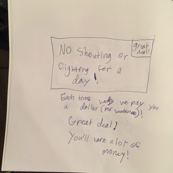 I am confident that I will get all the money back using the “No fighting for a day” coupon. Every time they fight, they pay me $1 (per sentence, but still…). Heck, she’s touting the fact that I’ll earn a lot of money.