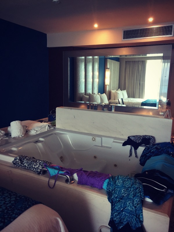 The Hard Rock Hotel Cancun offers a pretty wide assortment of rooms. We were looking for something family friendly, so we booked a Deluxe Platinum Double room. It had two double beds, a wonderfully sized balcony with a spectacular ocean view…and a double hydro-spa tub. In the middle of the room – I guess to better enjoy the view!