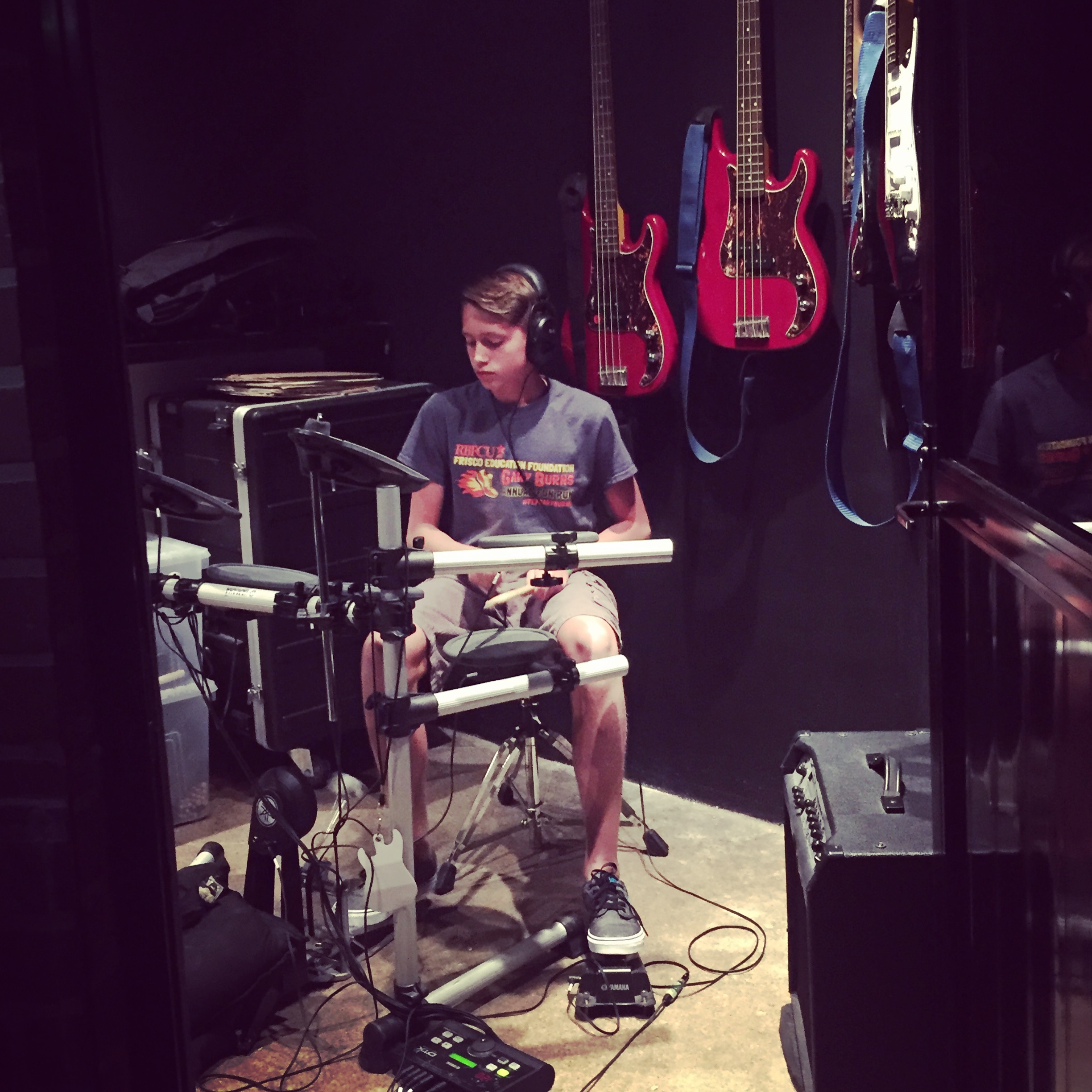 My son chose Studio Time. He’s a drummer, and the Music Lab staff set him up in their recording booth with a sleek set of electronic drums. He picked a song, they ran through it a few times for practice, then they recorded him playing it, overlaying his track onto the original. It took about a week for the to edit and mix his version before sending it to us. He had a blast.