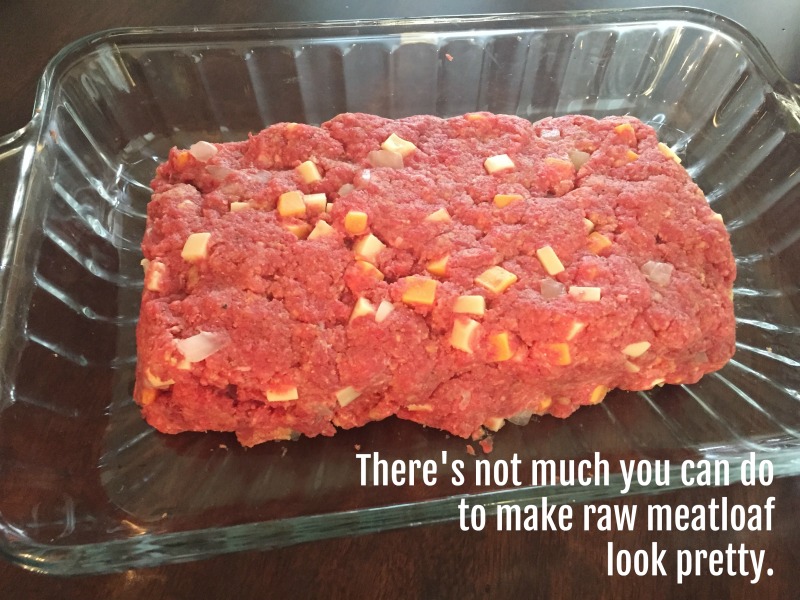 Pour meatloaf mixture into a 9×13 glass baking dish and shape into a rectangle, leaving at least 1″ of space between the edge of the loaf and the sides of the bowl.
