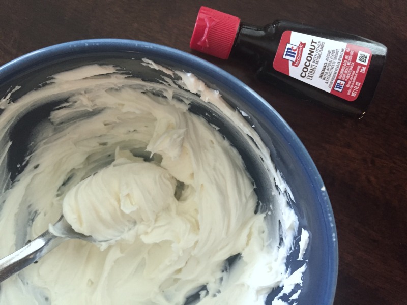 - In a small bowl, combine cream cheese, coconut flavor, and powdered sugar. Mix well.