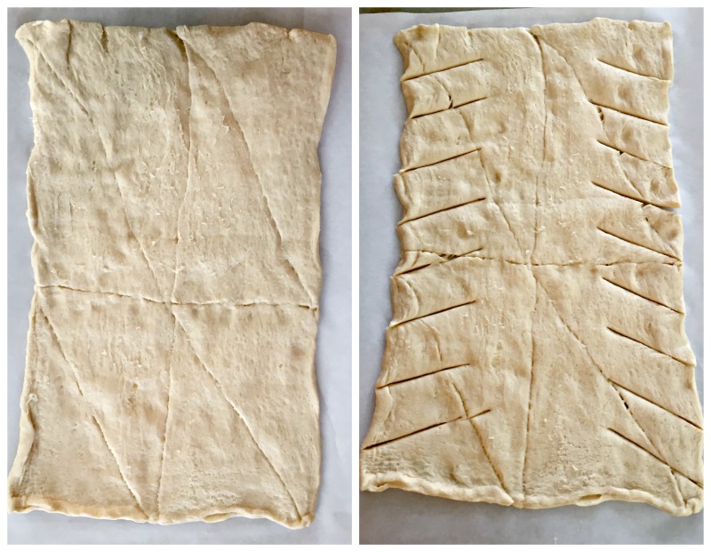 Unroll the crescent dough and smooth it out into a rectangle, pressing to seal any pre-cuts in the dough. Using a sharp knife, starting on one long side make nine cuts on a diagonal, about 1″ apart and about 1/3 of the way into the dough.